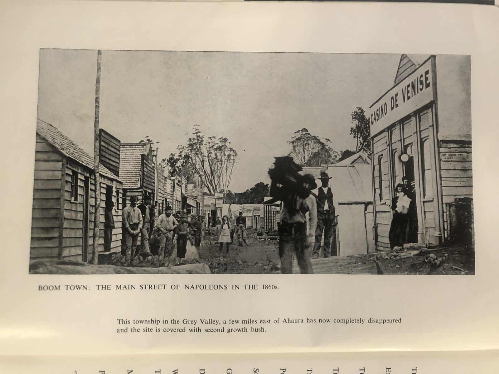 While my brother was here, the boys took him on a four wheel drive trip over Napoleon Hill, which is only a few miles east of us. In the 1860s, there was a thriving town there–apparently until the gold ran out! I believe there was some lumbering there, as well, but the town didn’t last very long. I spent some time one evening researching the town, but couldn’t find much information. This picture is in the front of a book we have titled Westland’s Golden Century 1860-1960; it seems to be the only picture in existence of the small town.