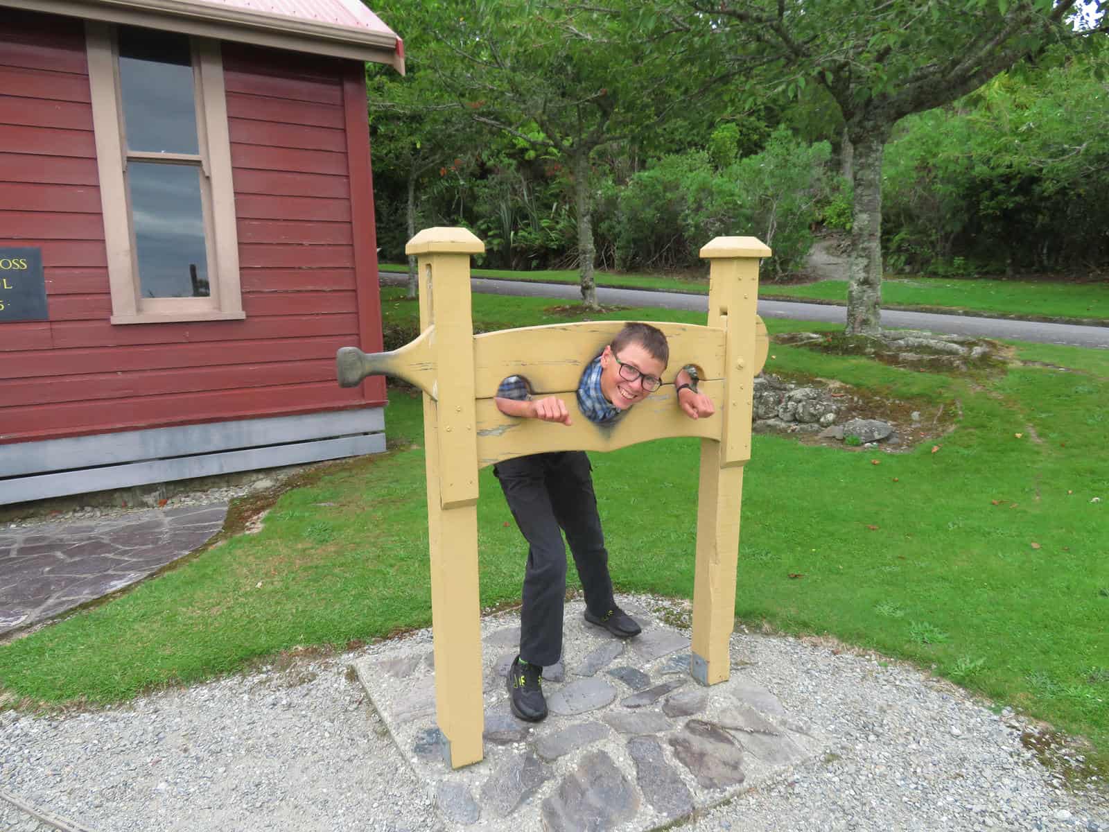 While my brother was here, my children took him and Mom to the Glaciers, a few hour’s drive south of us. Fox Glacier is now inaccessible because roads washed out, but they walked as close as they could to Franz Josef, and explored some other places around there, too. On the way down there, they stopped at a historical site in Ross, where Joe found himself in the pillary.